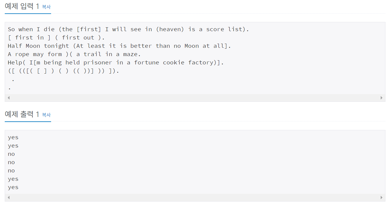 정민이의 임무는 어떤 문자열이 주어졌을 때, 괄호들의 균형이 잘 맞춰져 있는지 판단하는 프로그램을 짜는 것이다.